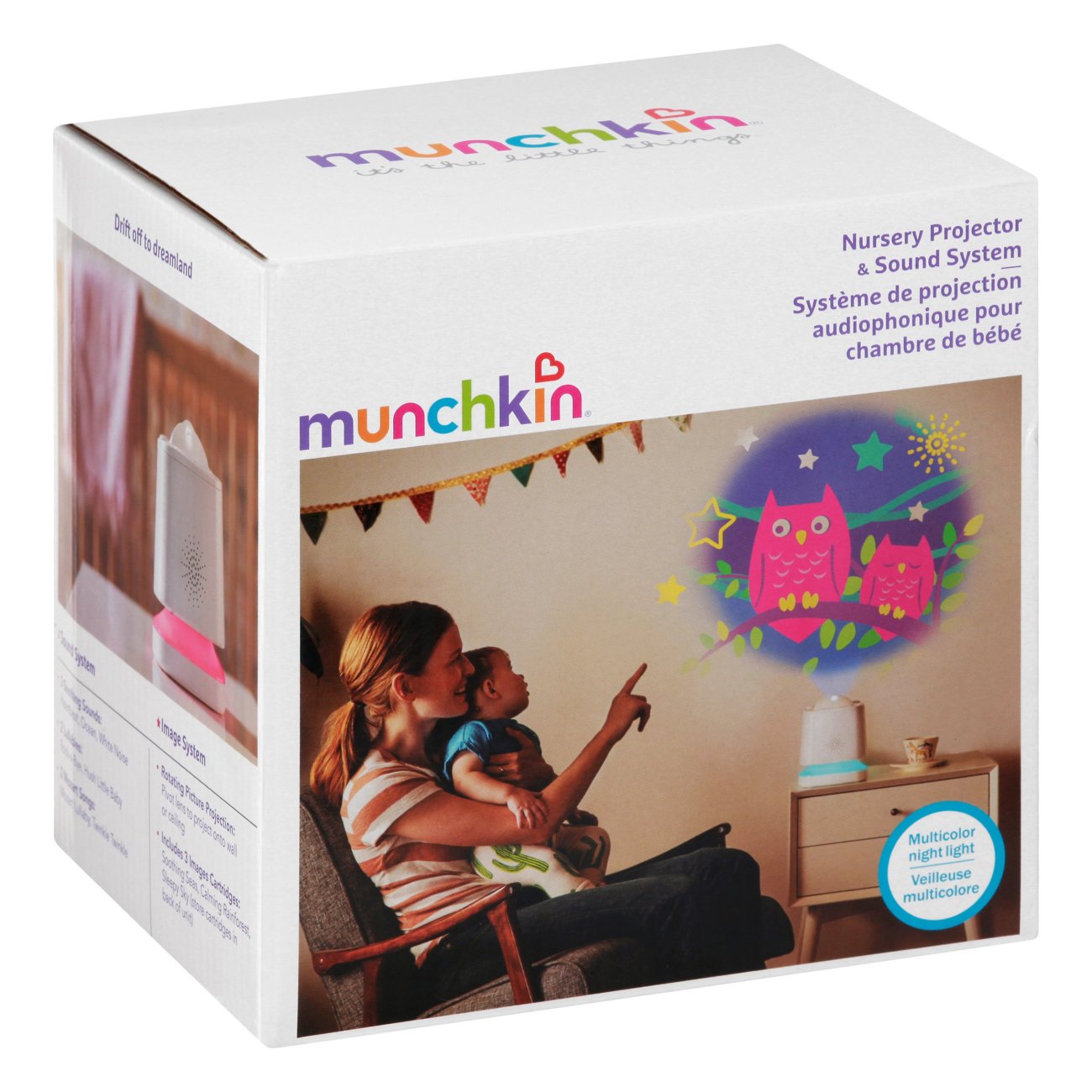 Your new best friend plays soothing sounds and lullabies projects adorable images to the wall and doubles as a multi-colored nightlight. The Munchkin Sound Asleep Nursery Projector and Sound System was designed to invite more zzzs into your life by stepping in when endless rocking bouncing and driving wont do the trick. The Munchkin Sound Asleep Nursery Projector and Sound System was designed to invite more zzzs into your life by stepping in when endless rocking bouncing and driving wont do the trick.